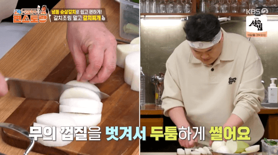5. 무 1/2개의 껍질을 깎고, 2cm 두께로 썰어줍니다. (무는 흰 부분을 사용해 주세요.)