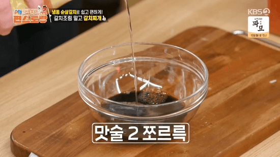 2. 볼에 양조간장 16쪼르륵, 참치액 2쪼르륵, 맛술 2쪼르륵을 넣습니다. (쪼르륵은 김준현씨 계량입니다. 한 번에 따르는 액체량을 쪼르륵으로 계산한 듯싶습니다.)