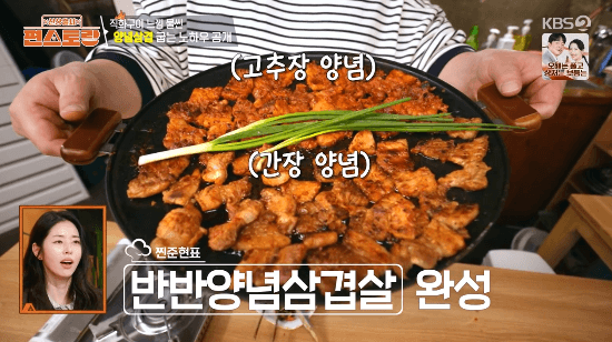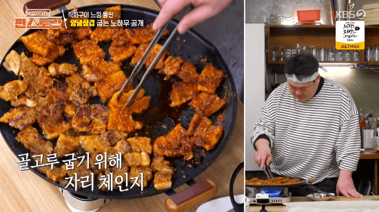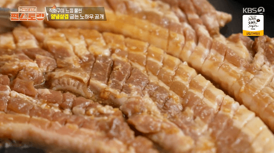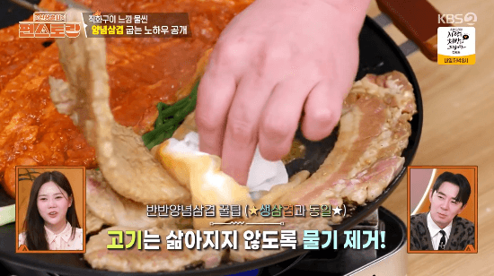 삼겹살을 구을 때 이상우씨 알려주는 쌈장소스를 발라가며 구워보세요. 삼겹살 맛이 훨씬 살아나요. 쌈장 삼겹살구이 - 이상우의 까나리 삼겹살구이 만들기 편스토랑, 이상우의 까나리 삼겹살