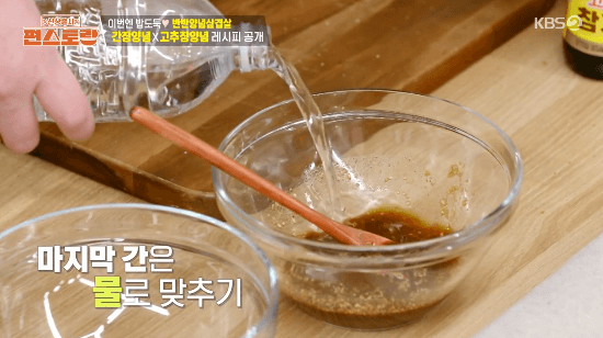 12. 참기름 1/2큰술, 물 1줄을 넣고 골고루 섞어서 고추장양념을 만듭니다.