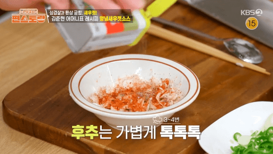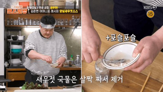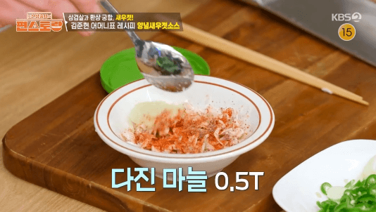돼지고기와 새우젓은 조합이 아주 좋습니다. 김준현씨가 맛있게 구운 삼겹살과 먹기 좋게 새우젓에 양념을 한 양념 새우젓 소스를 곁들여보세요.
