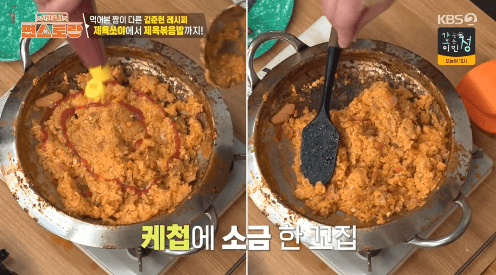 5. 케첩 약간, 소금 1꼬집을 넣고 볶아줍니다.