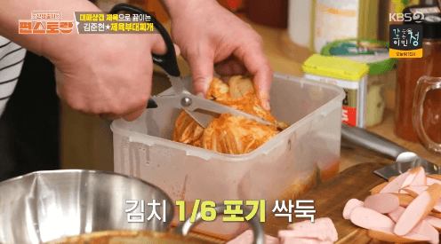 4. 배추김치 1/6 포기를 가위로 잘게 잘라줍니다. 김치 밑동도 다 사용합니다.