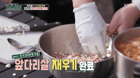 11. 김호중씨는 앞다리살 마늘구이를 만들기 전에 총각김치찌개를 만들었는데, 총각김치찌개 국물을 조금 넣어줬습니다. 참고하세요.