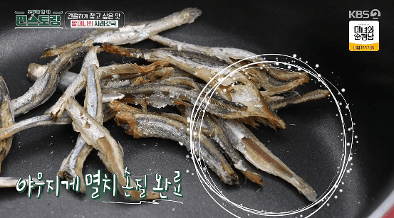 8. 불을 켜고, 냄비에 들기름 2큰술을 넣고 멸치를 1분 정도 볶아줍니다.