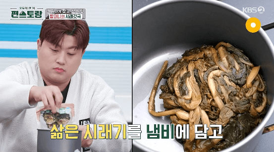 김호중씨는 예전에 할머니께서 끓여주신 시래깃국의 맛이 그립다고 합니다. 어떻게 하면 할머니께서 예전에 끓여주셨던 맛을 찾을 수 있을까 연구 중인 것 같습니다. 이런저런 여러 방법으로 요리해 보면서 지금까지 찾은 시래깃국 레시피를 알려준다고 합니다.