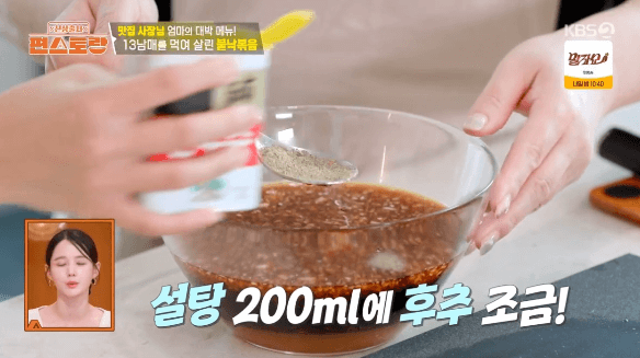 6. 설탕 200ml, 후추 약간을 넣고 골고루 섞어줍니다.