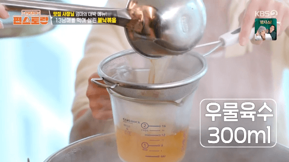 1. 우물 육수 300ml를 체에 걸르고, 식혀줍니다.