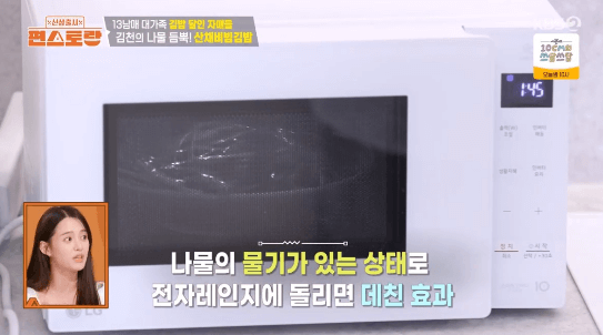 5. 나물을 전자레인지에 2분 돌려서 익혀줍니다. (물기가 있는 상태로 전자레인지에 돌려서, 뜨거운 물에 데친 효과를 냅니다.)