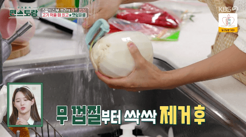 1. 무를 깨끗이 씻고, 껍질을 벗겨줍니다.