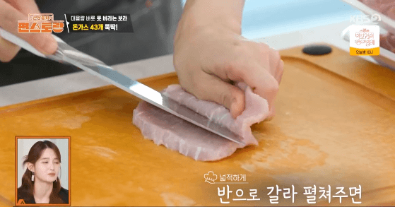 1. 등심의 끝이 완전히 잘리지 않을 정도로 칼집을 넣고, 등심을 반으로 갈라 넓게 펼쳐줍니다.