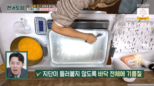 4. 팬에 식용유를 골고루 바릅니다. (키친타월에 식용유를 묻혀 바르면 골고루 바르기 쉽습니다.)