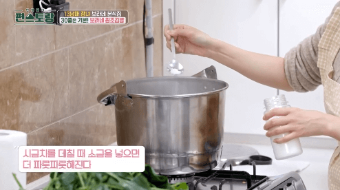 12. 끓는 물에 시금치를 데친 뒤 건져냅니다.