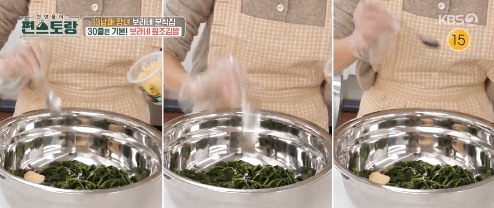 15. 시금치에 소금, 참기름, 다진 마늘, 깨를 넣고 버무려줍니다.