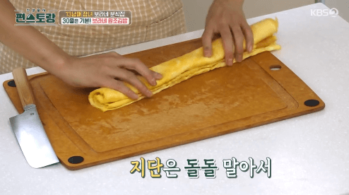 7. 달걀지단이 익으면 불을 끄고, 주걱으로 돌돌 말아 꺼냅니다.