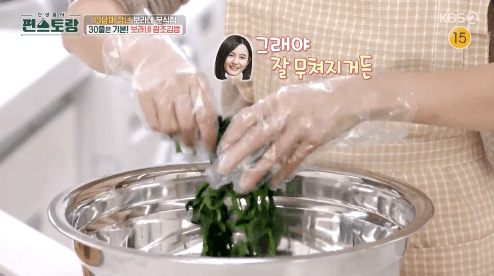 14. 물기를 짜느라 뭉친 시금치를 풀어줍니다.