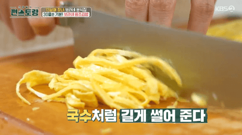 10. 계란 지단을 돌돌 말아서 국수처럼 얇고 길게 썰어줍니다.