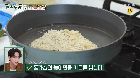 6. 팬에 기름을 넉넉히 두르고 예열합니다. 기름은 돈가스 높이만큼이면 충분합니다.