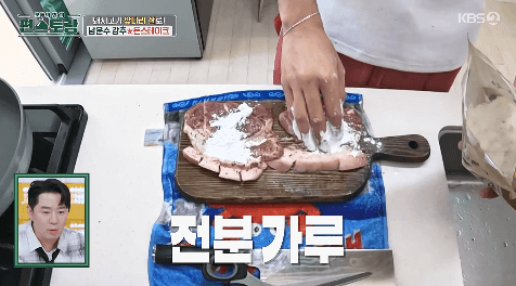 8. 고기 앞뒷면에 전분가루를 얇게 묻혀줍니다.