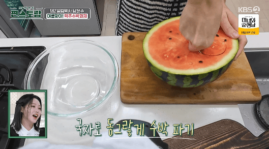 1. 수박 반통을 국자(또는 아이스크림 스쿠퍼)로 파서 그릇에 담습니다.