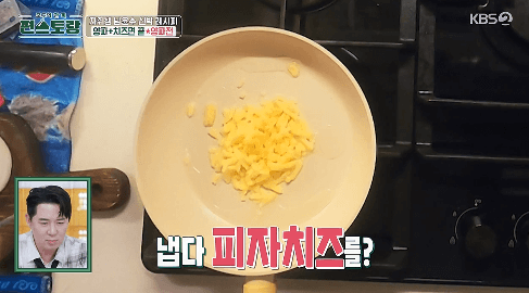2. 달군 패에 기름을 두르고, 피자치즈 60g을 넓게 펴서 녹여줍니다.