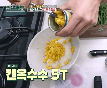 4. 밥에 옥수수캔 5큰술을 넣고 골고루 섞어줍니다.