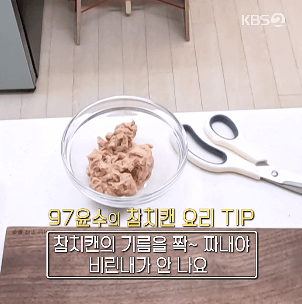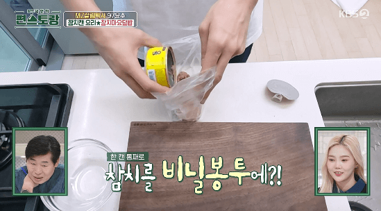 1. 참치의 기름을 빼줘야 하는데, 남윤수씨는 위생백을 이용합니다. 참치를 위생백에 담습니다.