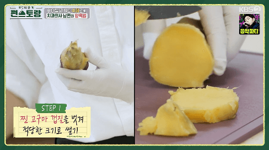 2. 삶은 고구마의 껍질을 벗기고, 1cm 정도 두께로 썰어줍니다.