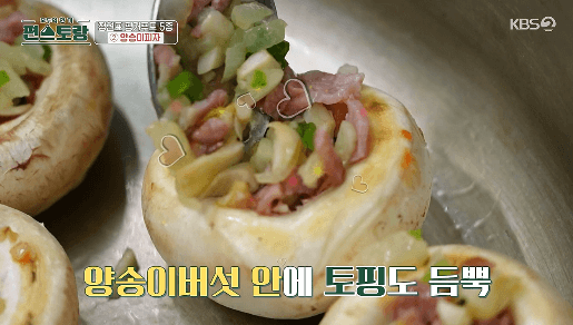 9. 양송이 뚜껑에 볶아 놓은 채소도 넣어줍니다.