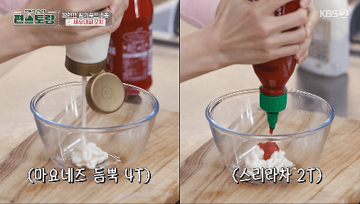 6. 소스를 만들겠습니다. 볼에 마요네즈 4큰술, 스리라치 2큰술을 넣습니다.