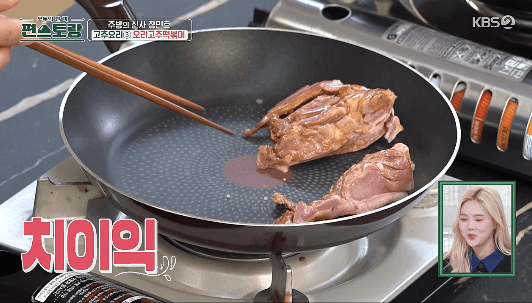 8. 팬을 예열하고, 훈제오리를 굽습니다.