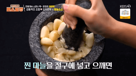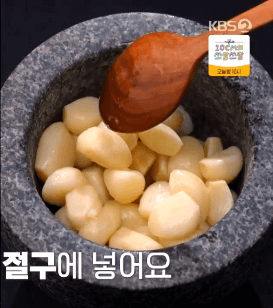 1. 찜기에 찐 마늘을 절구에 넣습니다.