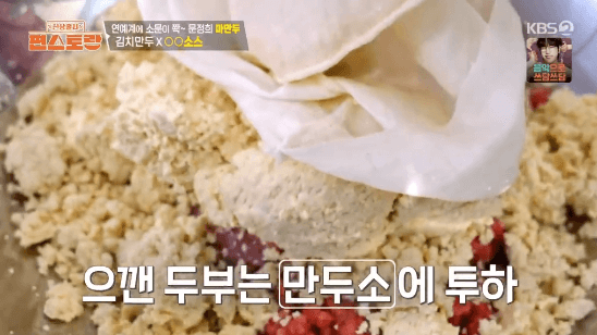 7. 으깬 두부, 잘게 썬 묵은지, 당면을 넣습니다.