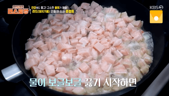 4. 물이 줄어들기 시작하면 약불로 줄여줍니다. (물이 날아가고 돼지기름이 나옵니다.)