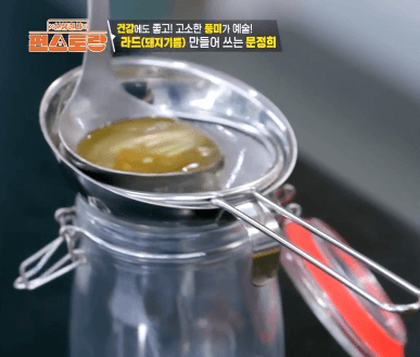 7. 다 끓은 돼지기름은 체에 걸러 유리병에 보관합니다.