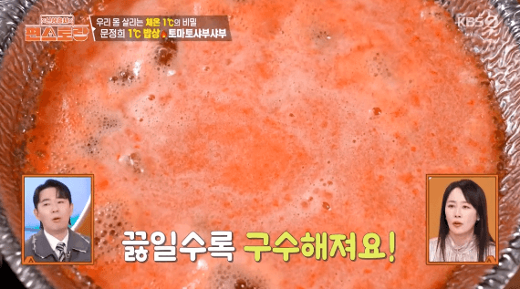 12. 냄비에 다시마 육수와 토마토 육수를 넣고 끓입니다.