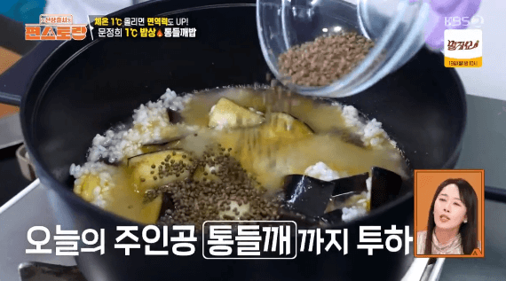7. 통들깨 듬뿍 2큰술, 쯔유 3작은술을 넣고 끓여줍니다. (쯔유 대신 진간장 1.5큰술로 대체 가능합니다. 간이 더 필요하면 소금으로 간을 하세요.)