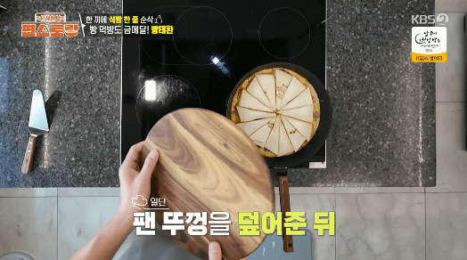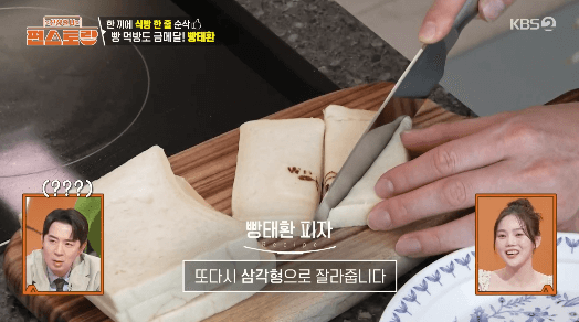 10. 아랫면의 치즈가 노릇노릇하게 익으면 꺼내 식빵 모양대로 잘라줍니다. (박태환씨는 뚜껑을 덮고, 뒤집어서 꺼냈습니다.)