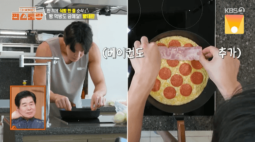 6. 치즈가 녹으면 페퍼로니, 베이컨 3줄을 올려줍니다.