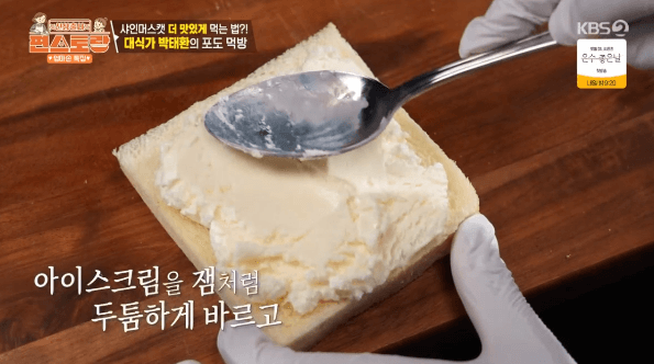 2. 테두리를 자른 식빵 1장 위에 바닐리 아이스크림을 듬뿍 발라줍니다.