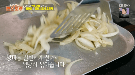 6. 양파가 살짝 익어 적당히 노릇노릇해질 때까지 볶은 뒤 한쪽으로 몰아줍니다.