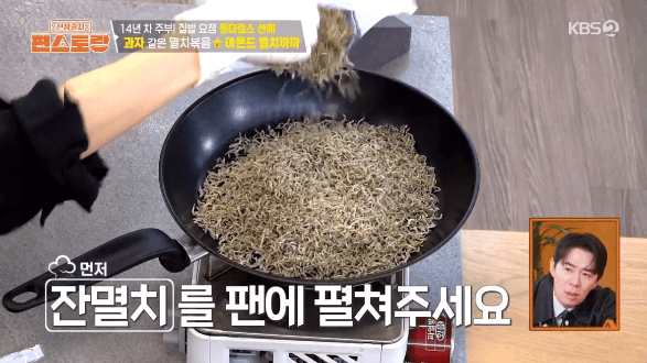 3. 강불에서 멸치를 볶아서, 비린내와 수분을 날려줍니다.