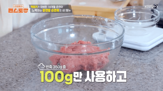 6. 고기 반죽 중 100g만을 사용하겠습니다. (나머지는 어른용 바싹 불고기에 사용하거나, 다음에 아기용 바싹불고기를 만드는 데 사용하세요.)