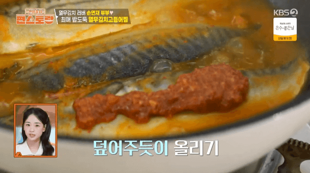 4. 볶은 열무김치 위에 고등어 3마리를 올립니다.
