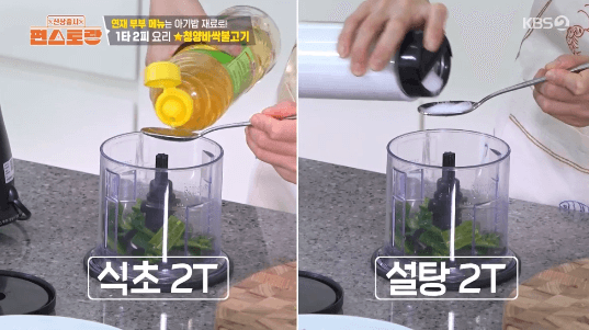 11. 식초 2큰술, 설탕 2큰술, 홍게액젓 1큰술을 넣고 믹서를 갈아줍니다.
