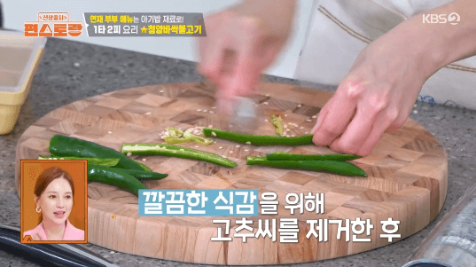 9. 청양고추를 가로로 반 가른 뒤 씨를 제거합니다.