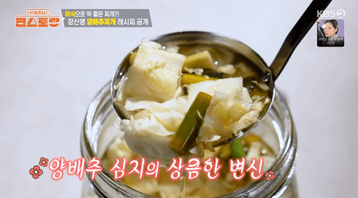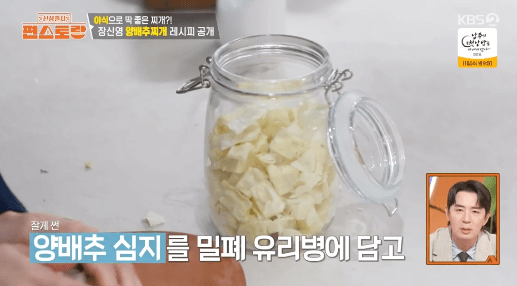 따로 재료를 구할 필요 없이 양배추로 양배추찌개를 끓이고, 단단한 심지로는 피클을 만들어 보세요. 알뜰한 장신영씨의 레시피로 남기는 거 없이 알차게 반찬 만들어 보세요.