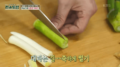 1. 대파 1대를 3~4cm로 자른 후 길쭉하게 반으로 잘라줍니다.