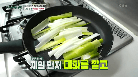 5. 달군 팬에, 대파를 깔고 그 위에 어묵을 올려줍니다.
