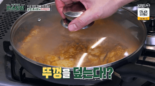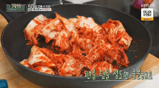 9. 수분이 사라지고 김칫국물이 졸아들면 뚜껑을 닫고 약불에서 5분간 익혀줍니다.